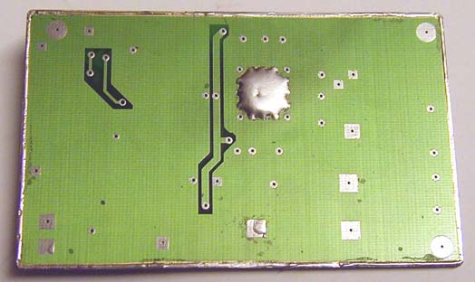 Photo shows the reverse of the PCB with the raised blob of solder where the green solder resist has been scraped off both sides of the PCB to enable the AD9852 to be soldered to the PCB using a 40W soldering iron