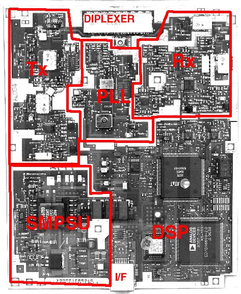 LO. This is probably the most useful part of the whole unit.It consists of an adjustable 10MHz refence oscillator feeding a (NS) Microwave PLL chip. The whole thing is serially programmable via the DSP processor (but could equally well be fed from a PIC chip. I have considered just cutting this part out and driving it from a PIC. I don't know the range of the VFO included - it has 620-1720 on the case- it may be the specified frequency range. The synthesizer will go up to 2.5GHz.