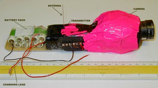 Latest camera pod design, shown below - about 230mm long, with camera and transmitter encased in foam and plastic sheeting. The tiny tinned copper wire antenna works surprisingly well.