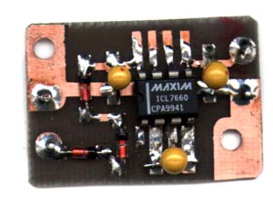 The assembled PCB shows the conventional components mounted SMD style (less drilling). The reverse side is unetched copper bonded thru at the ground connections, with clearance holes for the input and output pins. Tests show that the unit will provide 9V at the required 13mA with 130mVp/p ripple, but it will go beyond this to well over 30mA at 8V and 250mV ripple. After the on-board 7905 the ripple is less than 2mVp/p (about the same as the +5V supply - only higher frequency). The PCB has since been conformally coated and fixed by means of double sided adhesive tape to the rear of the front panel. A zip file with assy, artwork and BOM is available for download.