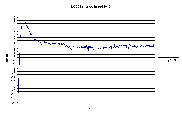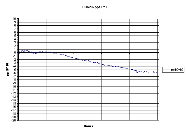 GPS - based on a Motorola UT+ receiver - a system which is now working to within a few parts in 10^11.(2001Jan19). However after much logging it has since been realized that the temperature sensitivity of the crystal causes a drift rate which is hard to follow at N=5. After advice from Brooks Shera, it has now been reset to N=3 which provides for a more rapid correction of temperature drift but with an increased granularity of around 1pp10^10. This will provide an accuracy and stability of around 1pp10^10 or 1Hz at 10GHz - plenty good enough for the beacon. Work to reduce the temperature effect is now reaching completion. Initial trials using a Peltier effect heat pump to control the external case of the reference oscillator, have been completely successful, and have resulted in a frequency stability and accuracy between +/-4 to +/- 1 part in 10^11 - depending on the time constant setting. Details will follow.New info 12 July 2001 A graph of the error control voltage using settings between N=4 and N=7 is shown below:-
